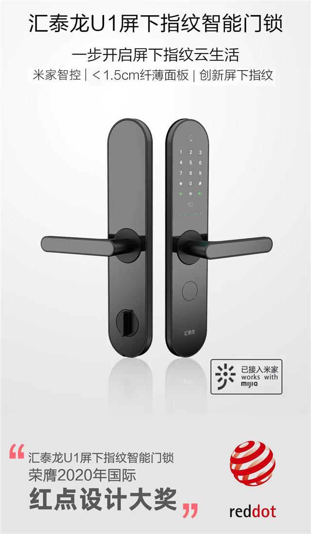 匯泰龍U1纖薄屏下指紋智能鎖應運而生,U1屏下指紋智能鎖,以Ultra thin(超薄)與Under Glass(屏下指紋)為設計理念,擁有<1.5cm厚度的炫酷面板外觀、屏下指紋、米家智控、五種開鎖方式、十五重安全防護等黑科技、安全的功能,榮獲“德國紅點產品設計獎”。