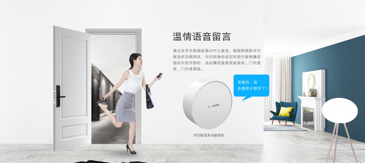 為了給家人更好的生活,我們投入更多的時間到工作中,陪伴家人的時間越來越少。為此,華為智選智能指紋鎖推出溫情語音留言功能,配合華為智能網關即可使用。“昨晚冰箱買了酸奶,這兩天要及時喝哦”、“昨晚我聽見你咳嗽,吃完飯記得吃藥”、“爸媽,感恩節快樂~愛你們喲”……生活瑣事溫馨提醒,節日溫情祝福。即使我們和家人的工作休息時間有時差,“陪伴”也不會少。