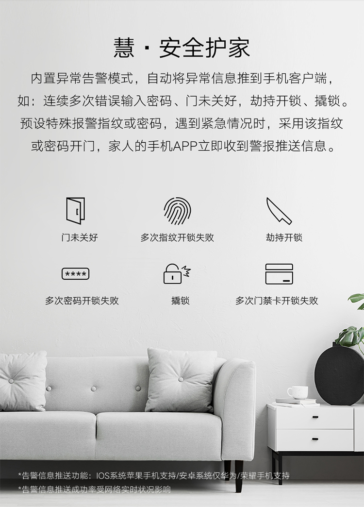 華為智選生態產品——匯泰龍智能指紋鎖不止步于常規智能鎖單一的監測功能,創新改進,采用多鎖舌聯動結構,通過華為智能家居APP可以隨時監測“門”的狀態,而不僅僅是業界普遍支持的對“鎖”的監測,一步到位,實現對家門狀態更準確的監控,以后再也不用擔心門忘記關。此外,通過華為智能家居APP還能實時接收異常告警,遠程快速增加指紋/數字/卡密碼(需在門鎖上驗證管理員管理員身份),以及更改密碼權限等等。