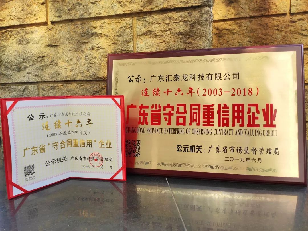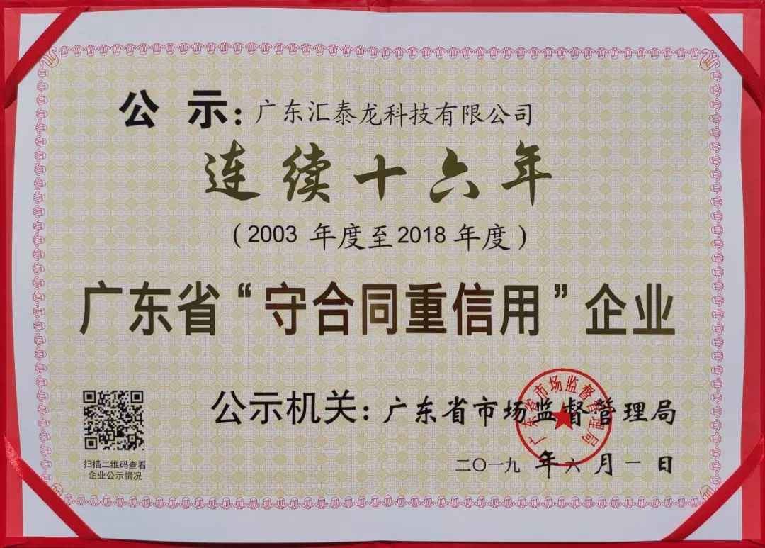 近日,經(jīng)廣東省市場監(jiān)督管理局嚴格審核并予公示,廣東匯泰龍科技有限公司(現(xiàn)已更名為“廣東匯泰龍科技股份有限公司”)被授予“連續(xù)十六年(2003-2018)廣東省守合同重信用企業(yè)”榮譽稱號。