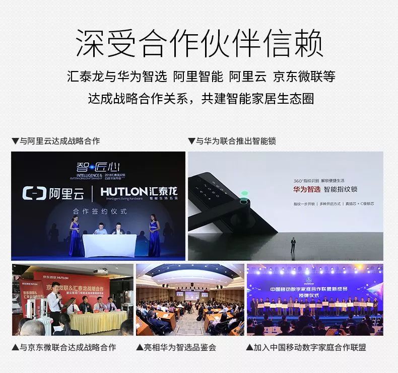 行業(yè)巨頭,精誠合作。2016年,匯泰龍在傳統(tǒng)的智能門鎖基礎(chǔ)上融入了云技術(shù),率先行業(yè)推出能聯(lián)網(wǎng)、能遠程監(jiān)控的匯泰龍安全云鎖,并與各大行業(yè)巨頭達成戰(zhàn)略合作。
