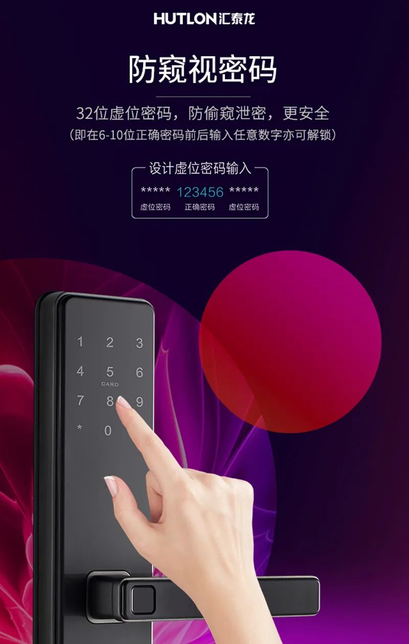 虛位密碼技術,是密碼開鎖中的一種。匯泰龍智能鎖支持的虛位密碼,我們可以在連續的正確密碼的前后,隨意輸入不規則數字,只要中間有連續正確的密碼就可開門,掩蓋真實密碼,做到防窺視。