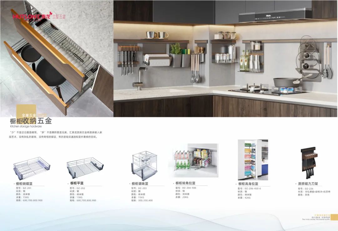 按動線規劃,巧用每一寸平面和立面空間,碗碟籃、平籃、調味籃、轉角拉籃、高身拉籃、升降籃、磁力刀架等多類型廚房收納五金,發揮“小空間,大收納”的作用,將柴米油鹽的生活瑣事變得井然有序,讓廚房承包全家人的“味蕾記憶”。
