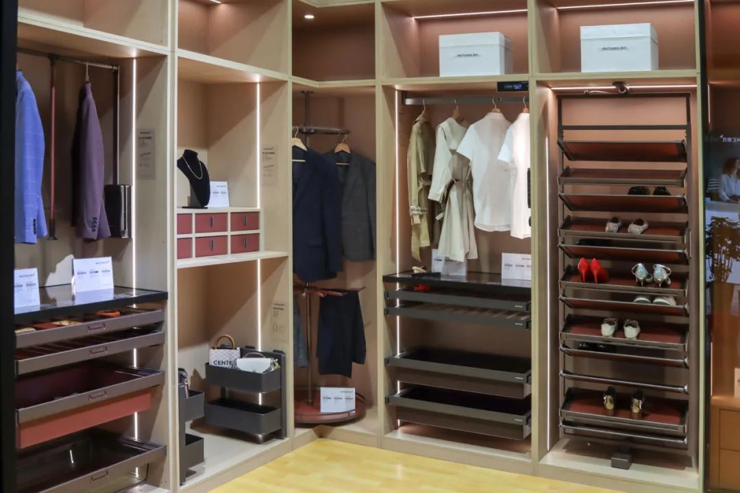 在衣帽間場(chǎng)景中,客商體驗(yàn)到緩沖收納籃、緩沖飾品籃、緩沖褲架、頂裝掛衣架、升降掛衣架、轉(zhuǎn)角選擇衣物籃、旋轉(zhuǎn)鞋架等多種款式的衣柜收納五金,不僅收納能力強(qiáng)大,充分利用每一寸空間,還讓衣褲鞋襪、飾品在適合的地方展示出自己的魅力,方便用戶從容應(yīng)對(duì)各種工作、感情、聚會(huì)場(chǎng)景。