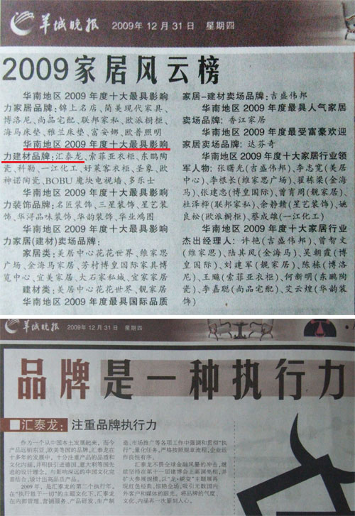 由羊城晚報《享周刊》《創意周刊》傾力主辦,羊城晚報報業集團旗下新快報、可樂生活、金羊網等多家媒體熱情協辦,廣東省裝修行業協會、廣東省家居商會等行業組織全力支持協辦的“華南地區2009年度最具影響力家居品牌”評選日前落下帷幕,評選結果在1231日的《羊城晚報》上進行揭曉,共有華南區36家品牌企業獲獎,其中,匯泰龍憑借雄厚的品牌實力榮獲“華南地區2009年度十大最具影響力建材品牌”。