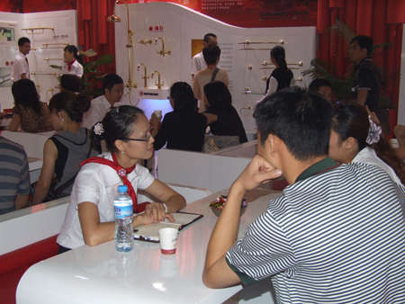 在每一個系列的產品前,公司都配備了一名專業的工作人員。這些匯泰龍工作人員具備五金衛浴行業深厚專業知識,在現場對產品的設計、材質、性能、優點等都作了詳細的講解。在匯泰龍新型電子門鎖展區,工作人員現場演示了門鎖的操作方法,吸引了眾多客商的目光。