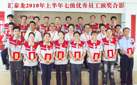 2010年8月5日13:30分,匯泰龍2010年度上半年度7級優(yōu)秀員工頒獎大會在生產(chǎn)基地五樓多功能會議廳召開。經(jīng)員工自發(fā)推薦,依據(jù)公平、公正、公開的原則,經(jīng)過嚴格的審查程序共評選出21位員工獲得“優(yōu)秀員工”的殊榮。行政中心副總楊珍寶女士、總經(jīng)理助理熊衛(wèi)軍先生、制造中心副總郭建彬先生、生產(chǎn)部主管熊軍先生出席了此次頒獎大會。