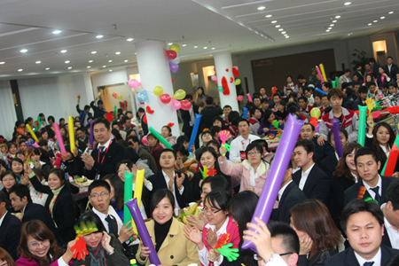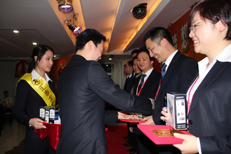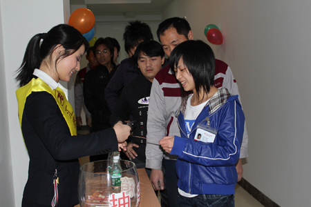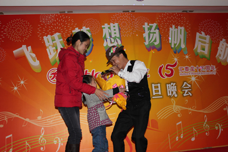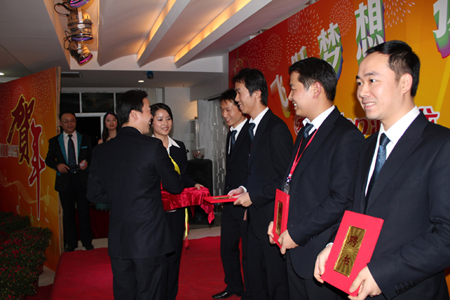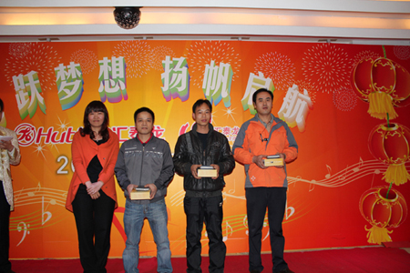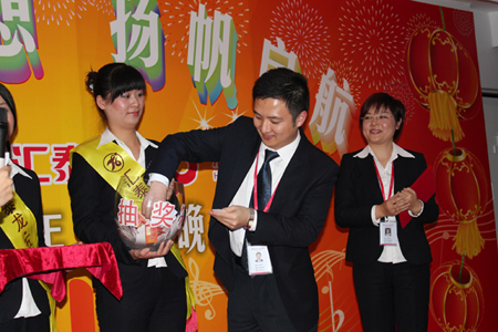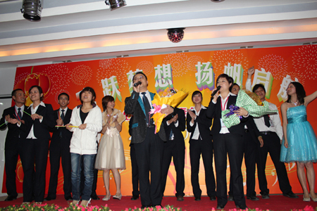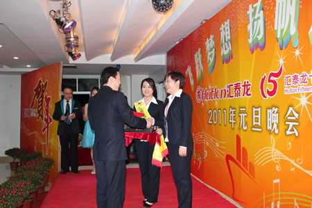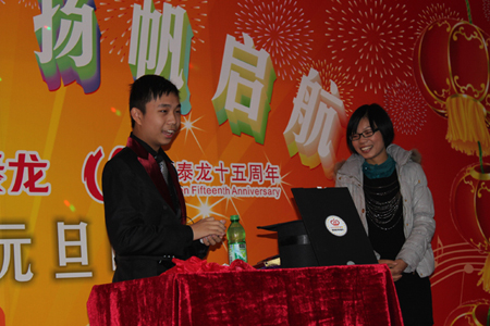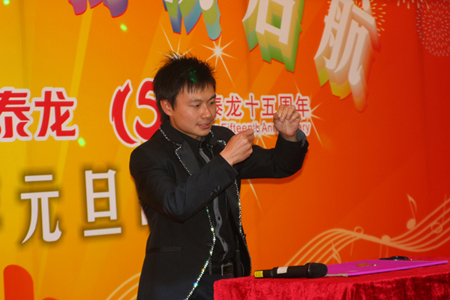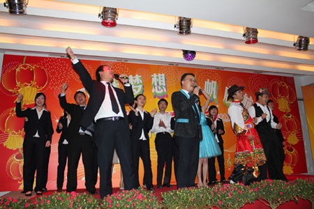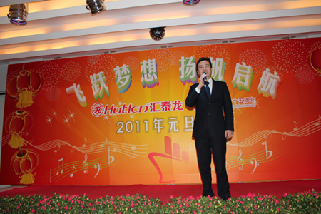 在四位主持人的引導下,陳董上臺發表新年賀辭,他首先向大家總結了我們在2010年取得的輝煌的成績,肯定了一年來全體匯泰龍人的付出和努力,描述了2010年我們取得的豐碩成果,也表達了公司在2011年新的展望和目標。最后,他熱情洋溢地表達了對在場所有的員工和員工家人新年的祝福,在場的員工深受鼓舞,報以雷鳴般的掌聲。