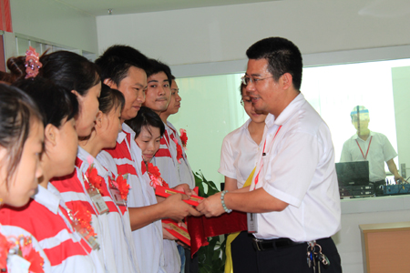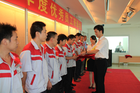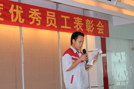 7月30日,匯泰龍佛山南海生產(chǎn)基地辦公樓五樓會(huì)議廳聲樂交響、燈火通明,匯泰龍2011年度上半年度優(yōu)秀員工(七級員工)表彰大會(huì)隆重召開。公司總經(jīng)理徐振忠先生、制造中心總監(jiān)莫志金先生、行政中心總監(jiān)任志平先生、三位部門經(jīng)理、三位車間主任及22名優(yōu)秀員工到會(huì),會(huì)議上徐總發(fā)表了講話,他首先指出,一個(gè)優(yōu)秀的企業(yè)離不開每一個(gè)優(yōu)秀的團(tuán)隊(duì),優(yōu)秀的團(tuán)隊(duì)的品質(zhì)必須由每一位優(yōu)秀品質(zhì)的員工才能體現(xiàn),受表彰的22位優(yōu)秀員工在平凡的崗位上兢兢業(yè)業(yè),足以成為匯泰龍人學(xué)習(xí)的榜樣。行政中心總監(jiān)任志平先生宣讀了《2011年度上半年度優(yōu)秀員工名單》,公司領(lǐng)導(dǎo)為22名經(jīng)民主投票評選出的優(yōu)秀員工進(jìn)行頒發(fā)榮譽(yù)證書,獲獎(jiǎng)員工吳忠望、潘祖庭代表全體優(yōu)秀員工發(fā)言,最后,所有嘉賓與優(yōu)秀員工合影留念。表彰大會(huì)氣氛熱烈,在圓滿完成會(huì)議議程之后,勝利閉幕。