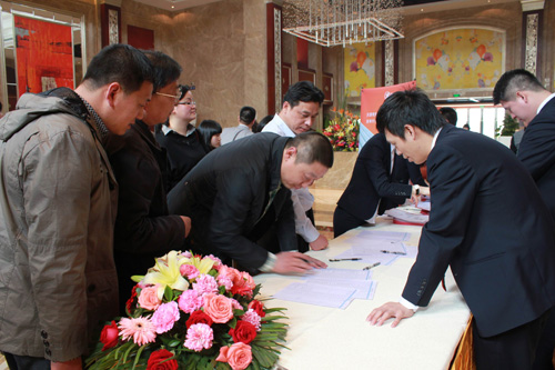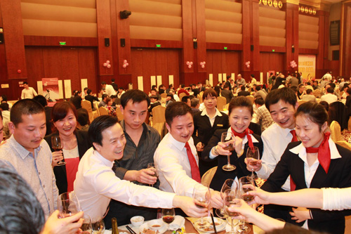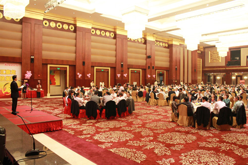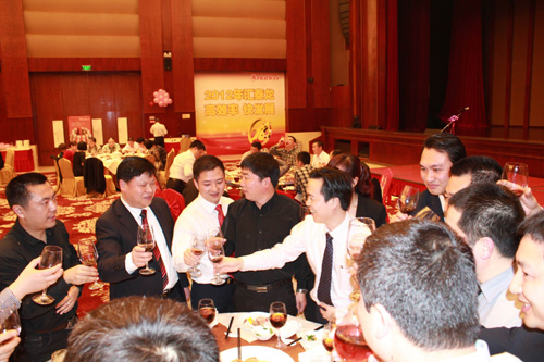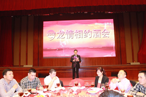 3月20日17:00,在全國經(jīng)銷商陸續(xù)到達(dá)廣東佛山三水綠湖酒店后,大家共同合影留下了美好的全家福大合影。隨即,龍情相約酒會(huì)開始。酒會(huì)現(xiàn)場(chǎng),公司董事長(zhǎng)陳鴻填先生在激昂喜慶的音樂聲中走上主題背景臺(tái),發(fā)表了熱情洋溢的祝酒詞。他首先表達(dá)了對(duì)經(jīng)銷商遠(yuǎn)道而來的熱烈歡迎,接著向大家總體介紹了匯泰龍2011年在行業(yè)內(nèi)取得的突出成績(jī),最后,陳董表達(dá)了全體經(jīng)銷商共同攜手、相互合作、共創(chuàng)佳績(jī)的愿望。酒會(huì)中,陳董、徐總以及匯泰龍高層管理團(tuán)隊(duì)一同輪流向每一桌遠(yuǎn)道而來的經(jīng)銷商祝酒,整場(chǎng)酒會(huì)氣氛溫馨,經(jīng)銷商們舉杯同慶,在相互的祝愿和經(jīng)驗(yàn)交流中,將酒會(huì)氣氛一次次推向了高潮。