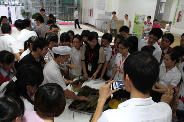 1830分,主持人徐小麗小姐激情四射的走向活動現場,宣布活動正式開始。她首先向大家隆重介紹了參加本次活動的來賓,接著簡要地介紹了端午節這一傳統節日的來歷和風俗習慣,說明了比賽活動的游戲規則。十支命名為“粽粽有神”、“粽橫四海”、“風之隊”、“匯粽情”等具有特殊意義隊名的隊伍陸續上場,一一向評委自我介紹,并大聲喊出隊伍的口號。經過食堂師傅的現場培訓,十支隊伍忙活開了:挑粽葉、放餡料……大家你爭我搶,氣氛非常熱烈。不一會,十支隊伍比賽完成,五位評委現場對粽子外觀進行分級評分。包粽比賽流程完成后,問答和搶答環節開始。在現場,活動主辦方準備了數十個與端午節和文明城市建設相關的題目對現場的參賽隊伍和觀眾提問,大家搶答的的非常踴躍,不僅獲得了豐厚的獎品,同時有增長了知識。綜合包粽比賽、外觀、問答三個環節的得分,活動評先出了一等獎1名,二等獎2名,三等獎3名,優秀獎4名,邀請了四位領導對獲獎隊伍頒發了獎品。活動最后,主辦方對所有的粽子進行現場義賣活動,由匯泰龍公司把所有的粽子買下來,這次義賣所得款項將全額捐獻給里水慈善會。