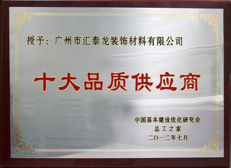 2012年7月,由中國基本建設優化研究會、中國房地產總工之家聯合組織的“中國十大品質供應商”的評比活動結果揭曉,匯泰龍公司榮膺“十大品質供應商”稱號,并獲得證書和獎牌。這是匯泰龍公司再一次榮獲全國性的獎項,標志著企業品牌進一步得到行業及消費者的充分認可。