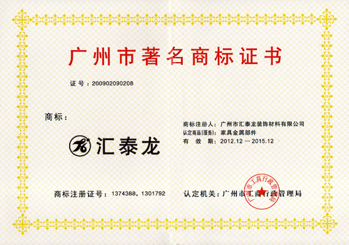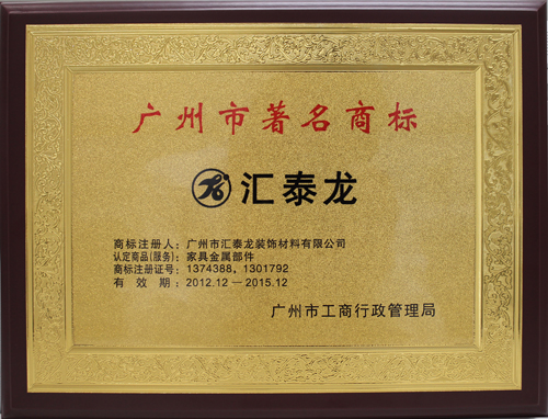 2013 3 月,廣州市工商局在《廣州日報》和官方網站發出公告,正式認定“匯泰龍”商標榮獲“廣州市著名商標” 榮譽稱號。