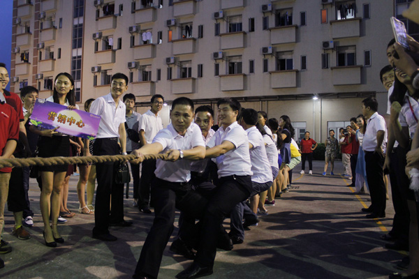 每年的中秋活動,拔河項目都會成為整場活動的焦點。全公司以中心為單位,被分為八支隊伍。哨聲一響,男女隊員就位,大家挽起衣服袖子,憋紅了臉,在紅頭繩的左右搖擺中,加油聲一浪高過一浪。在拔河比賽過程中,也出現(xiàn)了一些啼笑皆非的“笑料”:有人衣服都扯亂了,有人鞋子掉了,還有人累得一屁股坐在了水泥地上。叫喊聲、加油聲、歡笑聲布滿了整個活動現(xiàn)場。最終,制造中心憑借雄厚實力,輕而易舉把冠、亞軍收入囊中,人事行政中心攬得季軍。