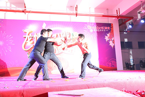 在四位主持人的引導下,陳董上臺發表新年賀辭,他首先向大家總結了我們在2014年取得的成績,對一年來全體匯泰龍人的付出和努力表示感謝,同時,他指出2014年受房地產行業的影響,整個家居建材行業都很嚴峻,我們匯泰龍公司全體同仁齊心協心仍然取得了一定的成績。面對2015年,我們通過轉型、一系列變革等措施,一定會繼續發力,再創匯泰龍的輝煌。最后,他熱情洋溢地表達了對在場所有員工和員工家人新年的祝福,在場的員工深受鼓舞,報以雷鳴般的掌聲。