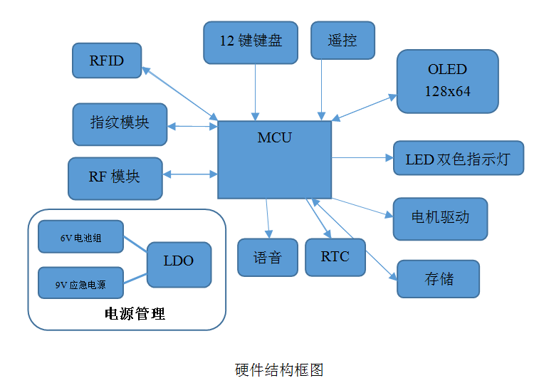 HZ-69206電控系統由主處理微控制器(MCU)、電源管理、非接觸M1卡讀取模塊(RFID)、顯示部分(OLED)、實時時鐘(RTC)、指紋讀取識別模塊、語音播放控制部分、遙控器接收模塊、信息存儲部分和狀態指示燈等部分組成,電控系統架構圖如下,整體電路集成度較高,電路設計模塊化構成,易于生產、維護提高產品的穩定性。