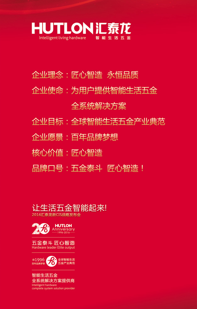 在匯泰龍品牌走過二十周歲之際,智能家居時代賦予匯泰龍新的使命和定義:打造國際高端智能生活五金第一品牌!延續(xù)求實、向上、敬業(yè)、和諧的文化根基,傳承匯泰龍20年輝煌底蘊及品牌影響力 。
