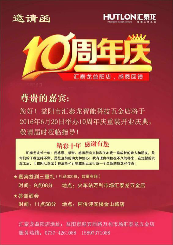 夏至將至,標志著夏天的來臨。夏日驕陽似火,不少地方已經開啟高溫模式。6月20日,在你享受著空調的清涼的時候,匯泰龍智能生活五金益陽萬利專賣店與太陽肩并肩,在一片歡聲中重裝開業!不僅有豐富禮品等你來拿,還有答謝酒會等你來約! 匯泰龍經歷了無數的風風雨雨,取得了眾多的榮譽,它的產品精雕細琢,精益求精,值得信賴!匯泰龍智能生活五金益陽萬利專賣店為您帶來高質量的五金建材產品,門鎖五金、裝飾五金、家具拉手、衛浴掛件……每一個產品,每一個細節都完美無瑕,讓人放心! 10周年慶重裝開業! 好禮相送,好酒相待! ——匯泰龍智能鎖系統—— 高科技產品,高端大氣,安全便捷! ——匯泰龍門鎖五金系列—— 無論現代古典、歐式中式,這里全都有! ——匯泰龍衛浴掛件系列—— 古典的味道,讓你感受藝術的氣息! ——匯泰龍家具五金、裝飾五金系列—— 品類繁多,應用盡有,歡迎選購! ——匯泰龍家具拉手系列—— 品質上乘,安全耐用,值得你信賴! 匯泰龍一如既往,用最好的產品回饋顧客,用最好的服務,讓顧客滿意。匯泰龍智能生活五金益陽萬利專賣店將秉承“匠心智造,永恒品質”的企業理念,以周全、貼心的服務態度和國際化的質量,為您提供智能生活五金全系統解決方案! 專賣店檔案 店名:匯泰龍智能生活五金益陽萬利專賣店 店長:譚先生 手機:158 9737 1088 電話:0737-4261088 地址:湖南省益陽市迎賓西路萬利市場匯泰龍五金店
