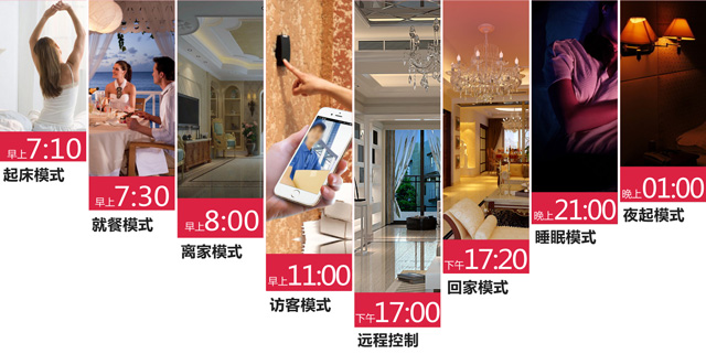 早上起床,系統按時打開臥室窗簾,讓第一束陽光把你叫醒,優美的背景音樂輕輕響起,空調啟動換氣模式,如果室內光線不足,燈光會自然亮起。美好的一天從舒暢中開始;