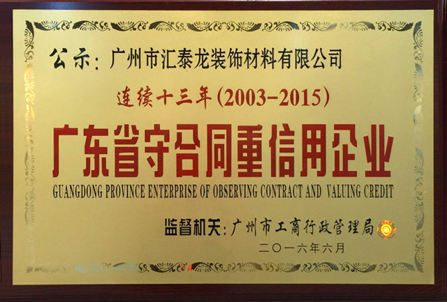 匯泰龍連續13年獲“廣東省守合同重信用企業”稱號