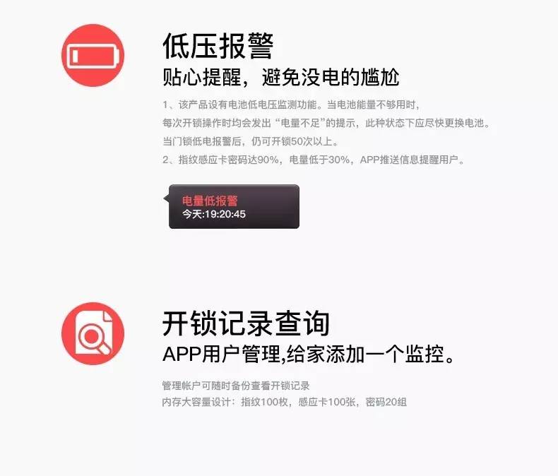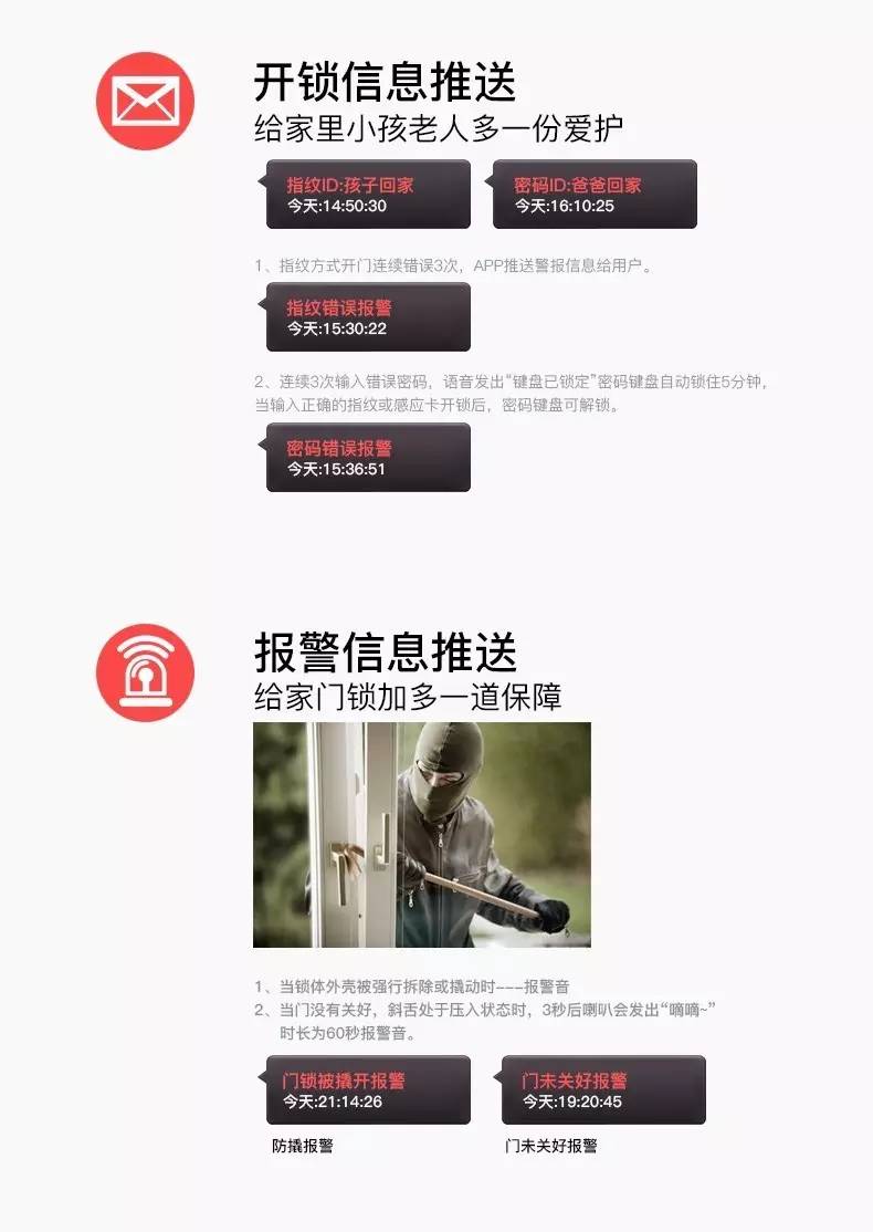 在安全方面,這款云智能門鎖采用一體化結構、上提把手反鎖設計,擁有異常報警信息推送、歷史記錄查詢、保持門鎖在線、在線故障處理等功能。