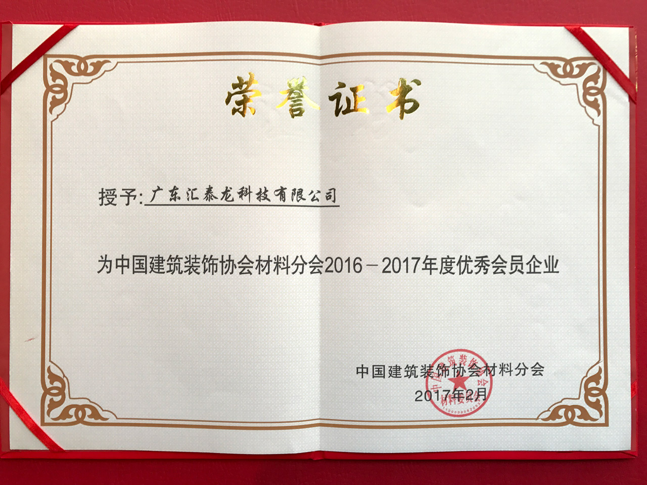 匯泰龍公司以其先進的研發能力,極高的技術水平及強大的行業領域影響力、市場占有率和良好的口碑,獲得了消費者的好評和業界同仁的一致認可,連任「中國建筑裝飾協會材料分會常務副會長單位」,匯泰龍董事長陳鴻填先生受聘為「中國建筑裝飾協會材料分會常務副會長」,同時匯泰龍榮膺「2017年度中國建筑裝飾協會材料分會優秀會員單位」。