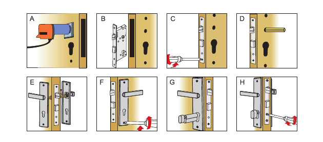 4安裝內外面板,使把手轉動順:擰緊螺釘(如上圖:E-F)。