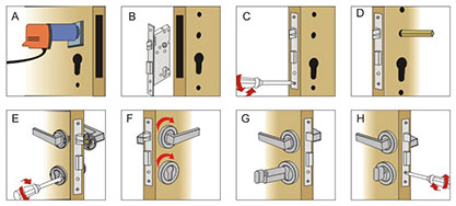 3、安裝內(nèi)外執(zhí)手圈組件,使把手轉(zhuǎn)動(dòng)順暢,擰緊螺釘,安裝內(nèi)外鎖圈,插入鎖芯(如下圖:E-G)。